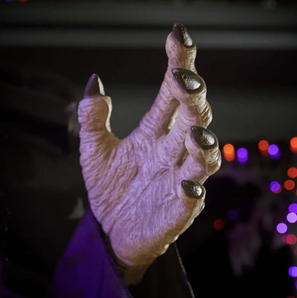 Foot hovering witch animatronic adds spookiness during the Halloween festivities.