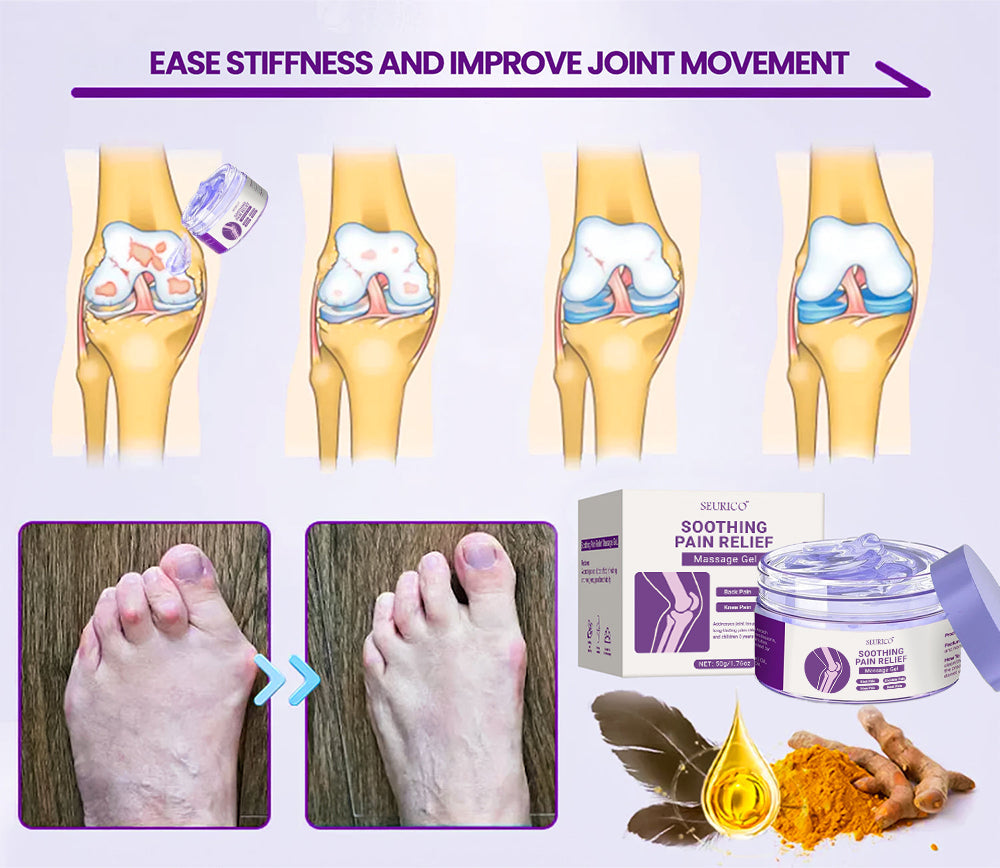 Seurico™ Gel contains turmeric (curcumin) and emu oil, both known for their powerful anti-inflammatory and pain-relieving properties. These ingredients work together to reduce joint inflammation, soothe stiffness, and promote long-term joint health by deeply penetrating the skin and targeting the root cause of the pain.