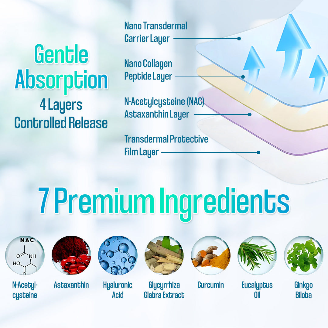 The Nano Lung Cleansing Patch features a unique double-nano formulation of nano-N-Acetylcysteine (NAC) and Astaxanthin, combined with nano-collagen peptides, offering powerful antioxidant and immune-boosting benefits. These active ingredients create a protective barrier in the airways and lungs, supporting the repair of damaged cells and effectively detoxifying the body. With regular use, the patch enhances the resilience of the respiratory system, reduces the impact of external pathogens, prevents respiratory infections, and promotes overall lung health, helping restore clear and easy breathing.