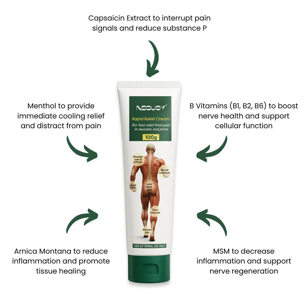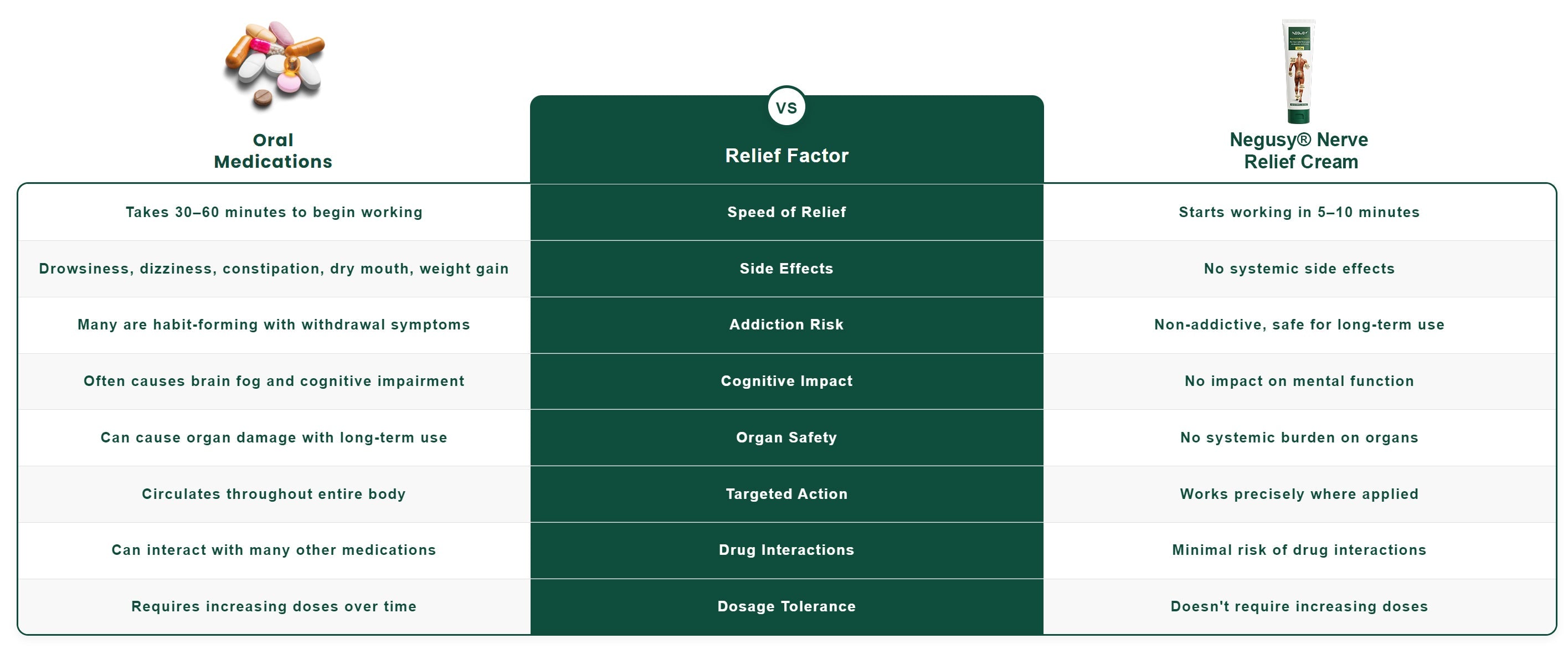 Unlike most topical treatments with harsh chemicals and artificial ingredients, Negusy™ Nerve Relief Cream delivers maximum relief through carefully selected therapeutic ingredients. Our pharmaceutical-grade formula provides powerful, targeted relief without harmful additives.