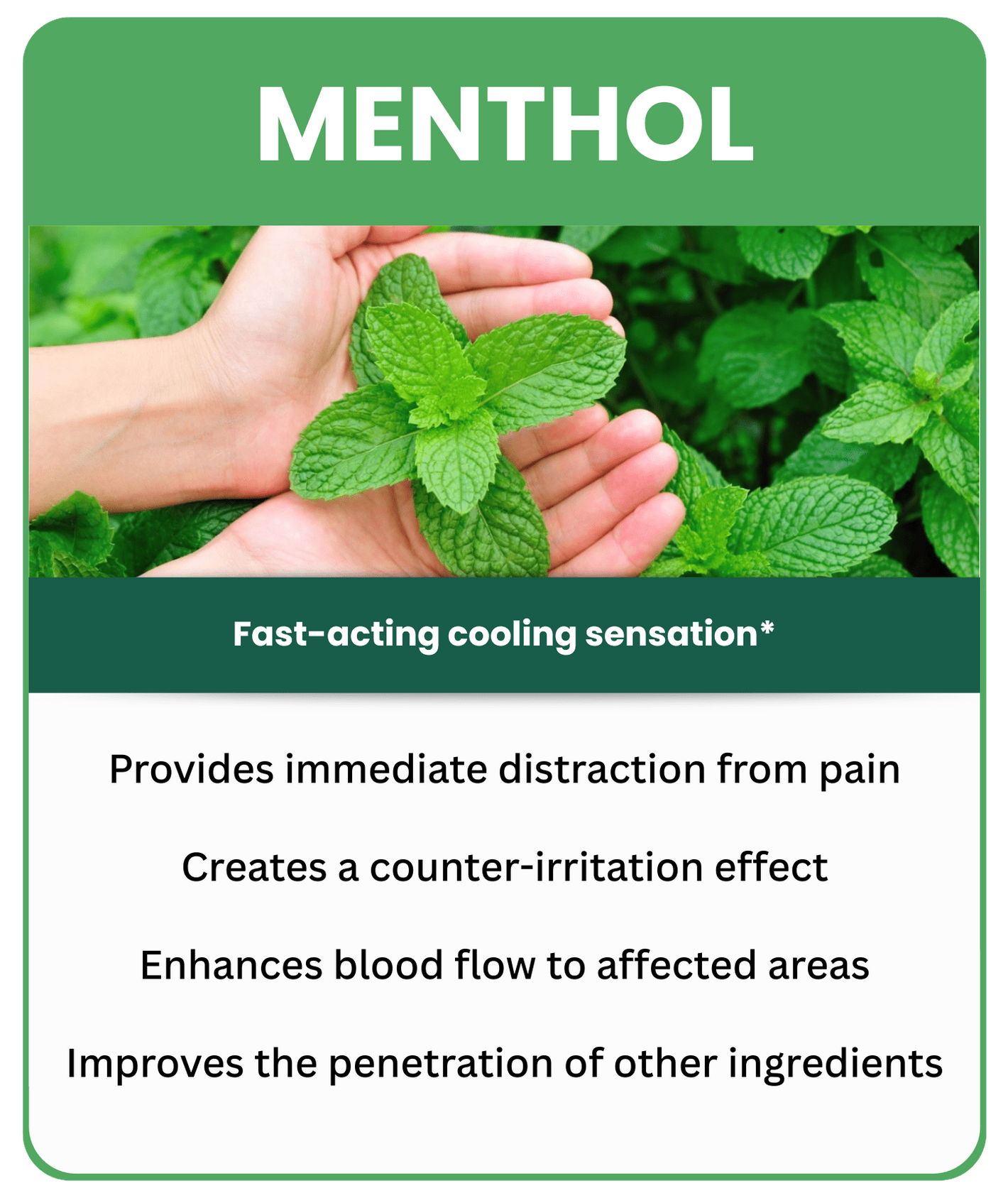 - Menthol (3%) to provide immediate cooling relief and distraction from pain