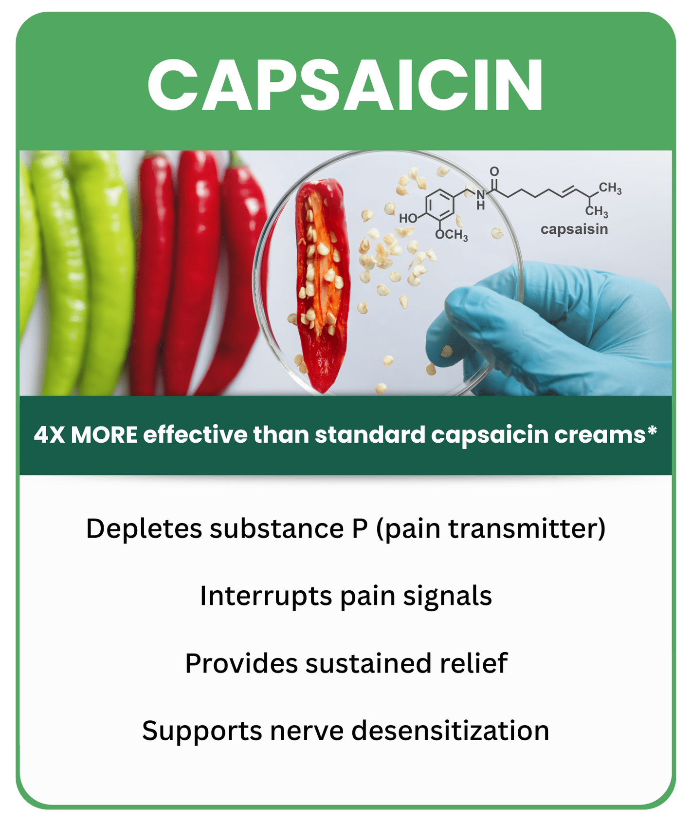 - Capsaicin Extract (0.075%) for interrupting pain signals and reducing substance P